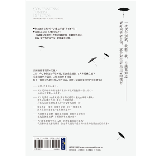 本書述說了許多令作者記憶猶新的葬禮故事,那一場場葬禮幫助他擁抱死亡與往生服務的正面意義……也就是「死亡正面觀」(death positive)……他也得以在禮儀師的工作中獲得滿足與成就。