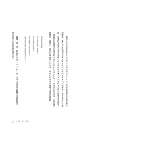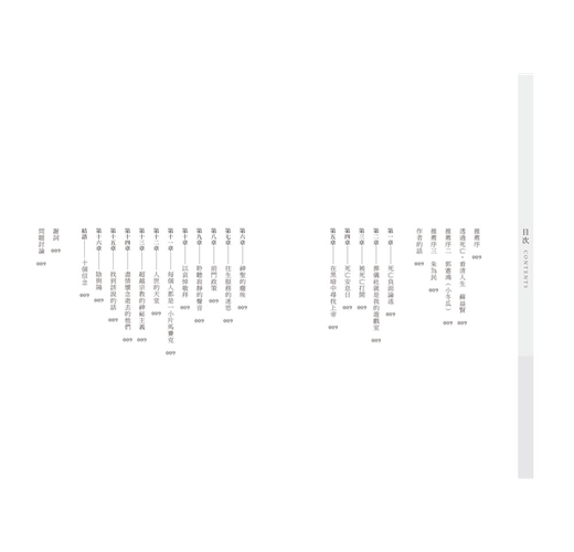 死亡就像一片放大鏡,將我們原有的恐懼放得好大。但同樣地,若我們能早點思考、理解死亡,它也將帶給我們不容小覷的力量。讀完本書你會發現,人生不再只是「生或死」、「克服或否認」的二選一難題。在死亡面前,好壞、善惡、對錯、黑白等二分思維已不再適用。死亡真正想提醒的是,你到底想活出一段怎樣的人生?