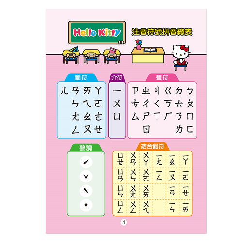 HELLOKITTY陪寶貝一起熟悉注音符號與拼音!清晰筆順練寫,大圖語詞舉例,強化聲符與韻符的多元組合,拼讀注音更熟練!搭配可愛插畫,另附1大張獎勵貼紙,讓學習更添趣味喔!清楚的注音符號與拼音解說