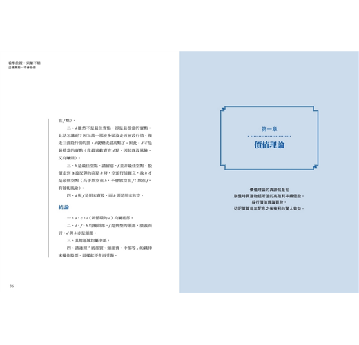 前者對應到書中,就是採取「價值理論」、「籌碼理論」、「順勢理論」、「停損理論」,後者是書中的「循環理論」、「棄取理論」、「抱股理論」等。所以從這裡讀者可以發現,雖然名稱巧妙各有不同,但背後原理都是相通的。本書實已囊括大多數重要的投資理論,但重點是,大家在研讀過程中仍需將書中內容不斷反芻思考,靈活運用在自己的投資體系中,才能發揮最大的效用。