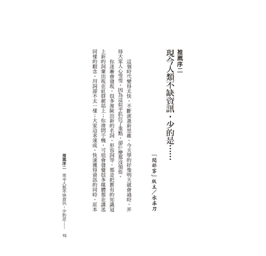 我想你會問:「該如何培養能力?抑或是怎麼知道去哪裡找到答案?」我的解方是「閱讀」。你所遇到的難題,都可能曾有人跟你一樣經歷過,無論是人際關係、經濟卡關、上臺簡報、親子溝通……尋求專家緩不濟急且費用昂貴,但多數的專家都出過書,把各種解方記錄下來,所以你需要用對方法,把書中的知識挖掘出來。因為閱讀不只是知識的汲取,更是人生卡關的解藥。