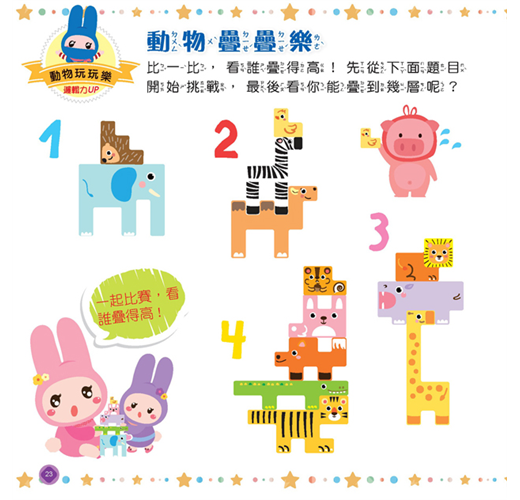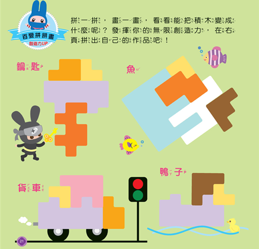 收納積木時,先試著讓孩子動動腦,自己拼拼看,如果遇到困難,可以參考遊戲書第一頁,上面有提示喔!多試幾次孩子就可以獨立完成,從中獲得成就感。