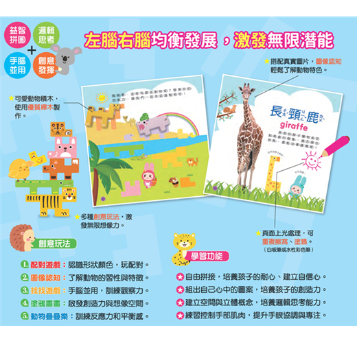 透過可愛的動物立體拼板,可以認識動物、顏色,建立空間概念,是款兼具遊戲與學習功能的益智教具。在拼圖過程中,還能提升手眼協調力、培養專注力與訓練思考能力。