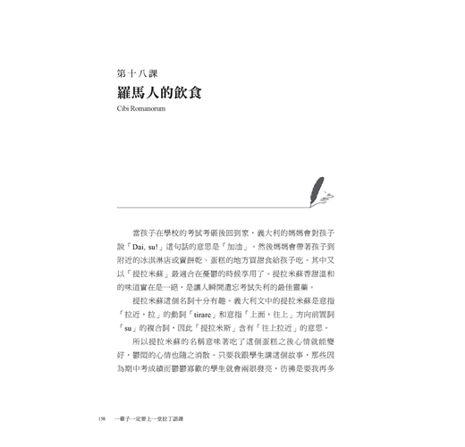 西方文明的根源拉丁語,複雜的文法是活化腦部,拓展思考系統最好的工具。三十六歲的達文西才開始學習拉丁語,卻喚醒他天才的潛能。對現代人來說能夠掌握具有組織性與數學性的拉丁語,自然而然就能產生一套屬於自己背誦與學習的方法。