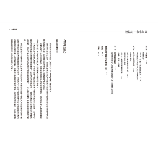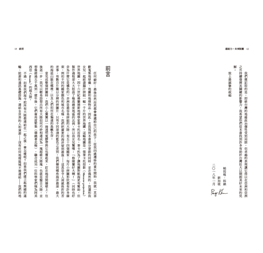 台灣版序(節錄) 親愛的台灣朋友: 我很榮幸把這本新版《連結力》(Connectography)獻給你們。 從本書初版發行以來,我接到蜂湧而至的各方佳評,認同本書有關連結性的根本性質及其影響力的核心訊息,和重繪正加速連結的全球網絡地圖的必要性。 台灣長期以來是亞洲貿易、金融和通訊與世界連結的領導國家,也是世界最成熟的經濟體和民主社會之一。台灣仍然是許多亞洲國家可以效法的楷模。 台灣面對極其困難的挑戰,包括與中國大陸緊張的關係、維持與外國邦交的困難,以及在中國和其他亞洲國家快速攀升價值鏈時,如何強化其經濟競爭力...