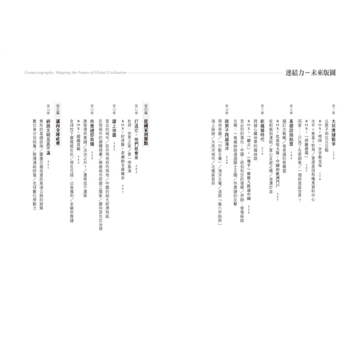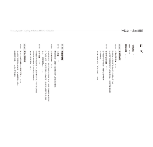 台灣版序 前言 解說地圖 第一篇 連結即命運 第1章 從邊界到橋梁 環遊世界/條條大橋通各地/百聞不如一見 從政治地理到機能地理/供應鏈世界/平衡流動和摩擦 第2章 新世界的新地圖 從全球化到超全球化/萬物的衡量標準/新地圖圖例 BOX:從外交到「城市外交」 第二篇 分權即命運 第3章 大分權 讓部落出頭/授權才能保持完整/從國家到聯邦 第4章 從分權到聚合 地緣政治辯證/通往印度治世的新大幹道/從勢力範圍到東協治世 從「瓜分非洲」到非洲治世/從賽克斯─皮科協定到阿拉伯治世 BOX:以色列例外? 第5章 新天命論 合眾國或共有財悲劇?/國內權力下放/太平洋的流動 流過世界最長邊界的油與水/北美聯盟 BOX:南美聯盟 第三篇 競爭性的連結 第6章 第三次世界大戰──還是拔河? 給後現代時期的古老譬喻/歐威爾說對了嗎? 風暴前的平靜?/其他手段的戰爭 第7章 大供應鏈戰爭 以原子和位元交戰 BOX:列印、分享和交易 水平+垂直=對角/資源基因和糧食資料中心 BOX:「供應循環」 回家──只為了在家銷售/一個經度區世界? 第8章 基礎設施結盟 擬訂大戰略/後意識形態聯盟 BOX:比雷埃夫斯:中國的歐洲門戶 從制裁到連結/當心友誼之橋/油濃於血 第9章 新鐵器時代 跨越心臟地帶的鐵絲路 BOX:「礦古」:(幾乎)條條大路通中國 忽必烈的復仇:中國─西伯利亞的復興/伊朗:修復絲路 北韓:一條鐵絲路通過隱士王國/供應鏈的反擊 第10章 跳房子跨越海洋 飛地帝國/「行動主權」/海洋主權/逃脫「麻六甲陷阱」 海上絲路/大西洋城市/北極區首府 第四篇 從國家到節點 第11章 打造它,他們就會來 杜拜:世界之家/第一停靠港 BOX:拉哥斯:非洲的全球城市 第12章 躍上地圖 冒出的城市/從外飛地到內飛地/中國的超大經濟特區 巨型城市的總體規畫/興建城市即建立國家/躍向混合式治理 第13章 供應鏈即救贖 誰管理供應鏈/法治之外?/遷移或不遷移 BOX:超越貪腐 全球性下層階級反抗/現在花錢,以後獲利/金融供應鏈 第五篇 邁向全球社會 第14章 網路文明及其不滿 無形的基礎設施/圍牆花園或資訊高速公路的路障 數位身分自助餐/散播連結財富/全球數位勞動力 第15章 大稀釋 混種文明 BOX:中國:帝制民族國家 全球護照/全球公民/公民權交易 第16章 自然之道不可逆 從海岸撤退 BOX:跨越邊界的河流 如何與自然協商 BOX:衡量供應鏈的足跡 地點,地點,地點 結 語 從連結到韌性 新道德指南針/自動運轉的網絡/建立無國界的世界 建議的地圖網站和繪製工具 致謝 註解