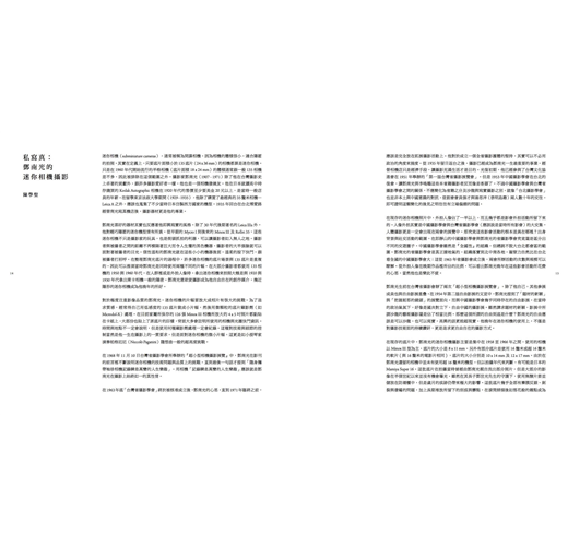 後來又購買性能較高級的德國製Meyer迷你相機,有1秒到1/500秒的快門設置,但戰前的放大機性能不佳,放大不出理想的相片,也就放棄了。到了1955年的時代,全世界開始流行極小型相機的風潮,世界...