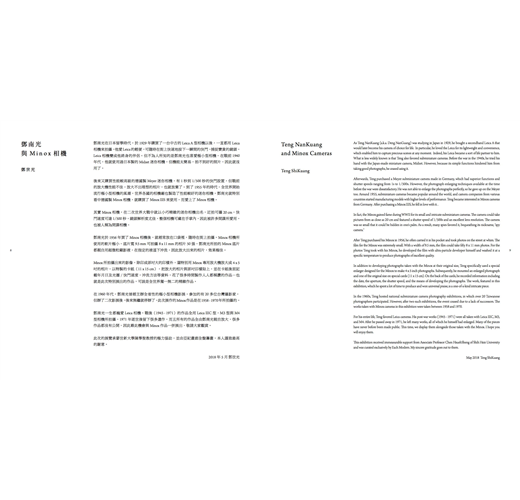 對於極度注重影像品質的鄧南光,迷你相機的片幅要放大成相片有很大的挑戰。為了追求質感,經常得自己用低感度的135底片裁成小片幅,然後用微顆粒的底片顯影劑(如Microdol-X)處理。在目前家屬所保存的126張Minox III相機所放大的 4 x 5 吋照片都黏貼在卡紙上,大部份也貼上了原底片的印樣,背面大多會註明所使用的相機與光圈快門資訊。時間與地點不一定會說明,但是使用何種顯影劑處理一定會紀錄,這種對技術與細節的控制當然是他一生在攝影上的一貫要求。- 陳學聖