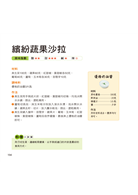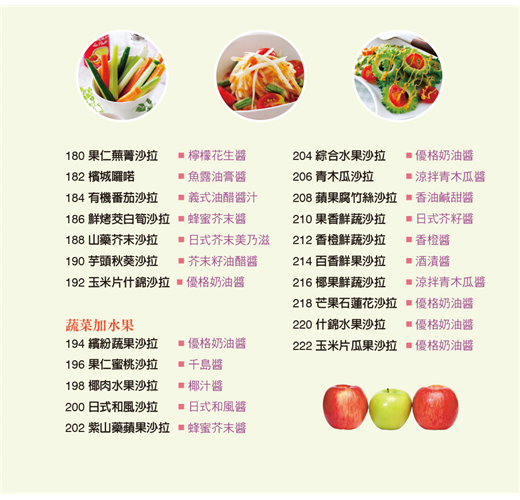 ● 爽口沙拉輕鬆做,內容分為蔬果沙拉料理、海味沙拉料理和輕食沙拉料理三大單元,每道食譜皆附適合搭配的醬料作法,並提示料理訣竅,輕鬆做出多種口味的沙拉。