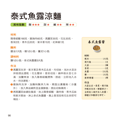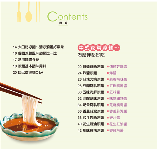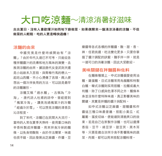 ● 消暑涼麵輕鬆做,內容分中式家常涼麵、異國風情涼麵和百搭涼麵醬三大單元,每道食譜皆附醬汁配方和作法,並提示製作訣竅,輕鬆做出各種口味的涼麵。