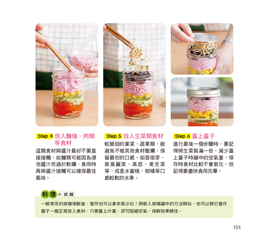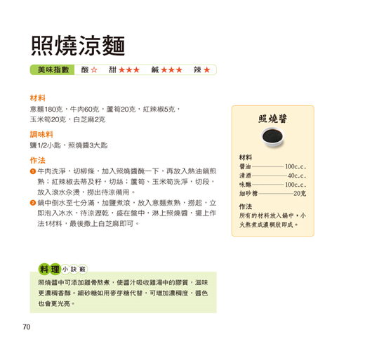 ● 介紹90餘種美味醬料搭配涼麵、沙拉料理,隨手拌一拌,酸、甜、香、辣,任君挑選,自己在家做,天天換花樣!