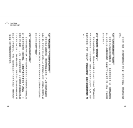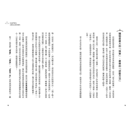 於是,作者決定將親身力行並深獲好處的方法,以過來人的經驗分享,寫給那些對「限量品」、「限時搶購」、「最後一件」說詞完全沒抵抗力的人們,讓大家都能透過有效減衣練習,來讓自己的生活過得簡單、時尚又幸福。