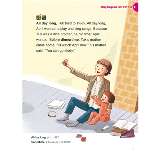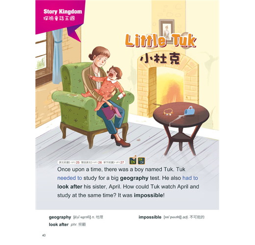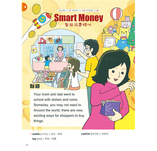 精選以孩童生活相關的主題,分為四個學習單元:圖解主題單字、主題漫畫會話、主題文法、主題延伸閱讀;每個單元皆附有趣味的練習及遊戲,讓讀者在學習之後輕鬆地自我評量。本期主題「Let’s Go Shopping! 去逛街吧!」,以大型購物中心為場景,介紹購物中心中主要的商店,例如:電器用品店、美食區、運動用品店、服飾店、鞋店、玩具店、服務台等等。主題延伸閱讀介紹智能消費時代的特性及新加坡儲蓄銀行為小學生推出的智能夥伴計劃 (POSB Smart Buddy) 。
