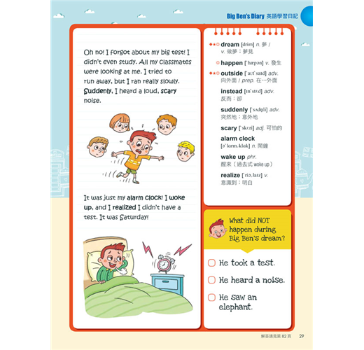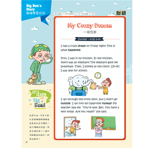 以小男孩Big Ben(大班)活潑有趣的塗鴉日記帶出學習主題,日記內容與生活知識或經驗有關。本期內容是Big Ben做了一個考試的夢而他完全沒有準備,在下一單元「小小知識家」以此主題探討為何會做這個夢以及其他常見的夢所表達的意境。