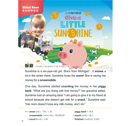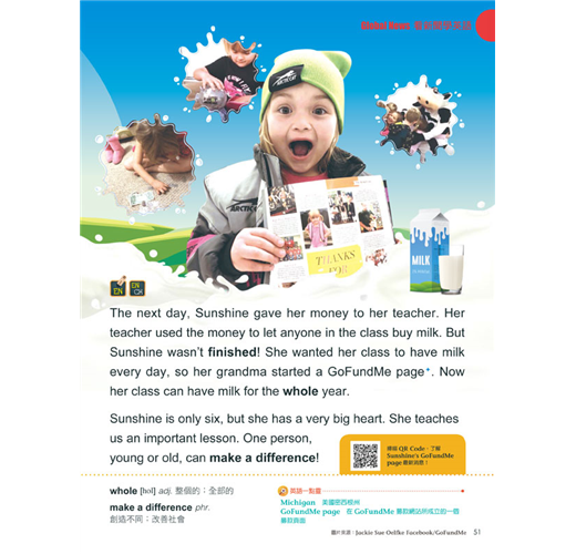 收錄國內外具有教育意義的新聞新知,藉以培養國際觀。本期報導美國密西根州的地方新聞,一位6歲小女孩捐出撲滿裡的錢幫助家境困難的同學繳交點心時間的牛奶費用,小女孩想幫助更多無法繳交牛奶錢的同學,因此她的祖母在募款網站集資,幫助小女孩圓夢。