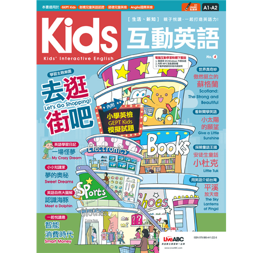 Kids互動英語No. 4延續「快樂讀英文」的目標,以更豐富的主題引領讀者進入多采多姿的悅讀之旅,增長知識也拓展視野,並培養宏觀的人格。本書共有八大主題,內容取材包含生活知識、自然科學、新聞新知、世界文化、台灣風情、經典童話等,以簡潔的文字搭配生動的彩繪插圖引發學習樂趣,增進孩子學英語的動力。搭配LivePen智慧點讀筆使用本書,課程內文可隨點隨聽,學習更有效率!