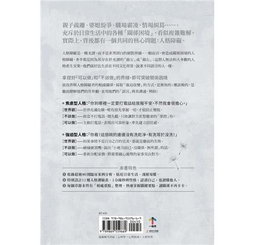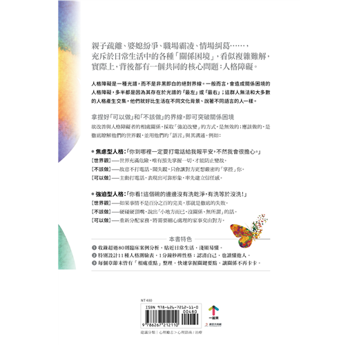 你知道嗎?現代社會中許多常見的關係衝突,多與「人格障礙」有關。人格障礙不是缺陷或疾病,而是一道光譜,有輕有重(有時我們自己就是存在於光譜當中的人);但是無論輕重,若我們無法「理解」、「接受」這些人格障礙的存在,那麼生活中的關係衝突,就會一直隱隱存在,成為生活中的不定時炸彈。也許,學習如何應對人格障礙者,是現代人最重要的課題,如此,可能許多社會新聞的憾事,就不會發生了。