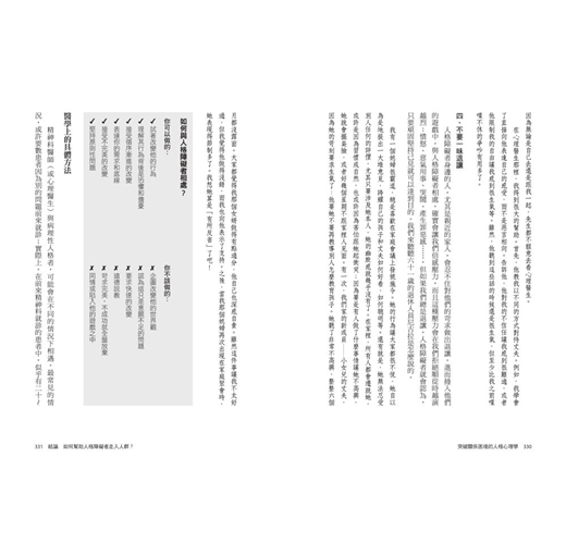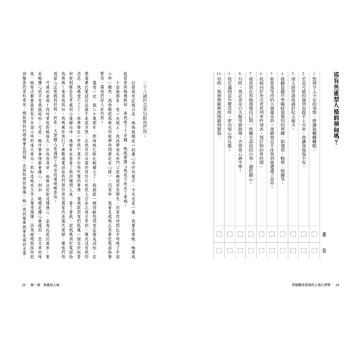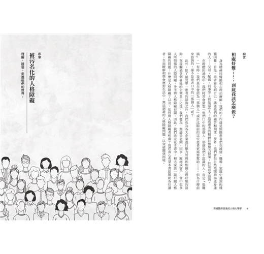 此外,除了接受單一患者的諮詢之外,我們也為各大企業進行壓力管理和相關心理狀態的諮詢。在接觸過各個層級的企業員工之後,我們發現,無論是老闆、同事、廠商或客戶,當中很多人所煩惱的人際問題,多半與人格障礙有關。因此,我們決定在本書中,和大家談一談有關人格障礙的問題:什麼是人格障礙?以及,如何與人格障礙者相處?我們衷心希望本書能幫助各位讀者,全面瞭解和學會應對生活中,無法迴避的人格障礙問題,以突破關係困境。