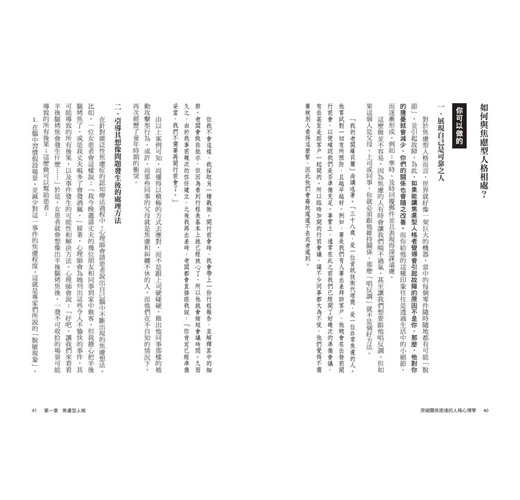 這麼做並不容易,因為焦慮的人有時會讓我們喘不過氣來,甚至讓我們想要跟他的期待唱反調。但如果這個人是你的父母、上司或同事,你就必須跟他維持關係,那麼「唱反調」就不是個好方法。