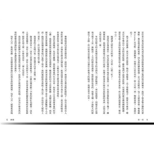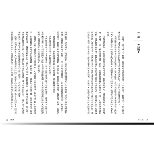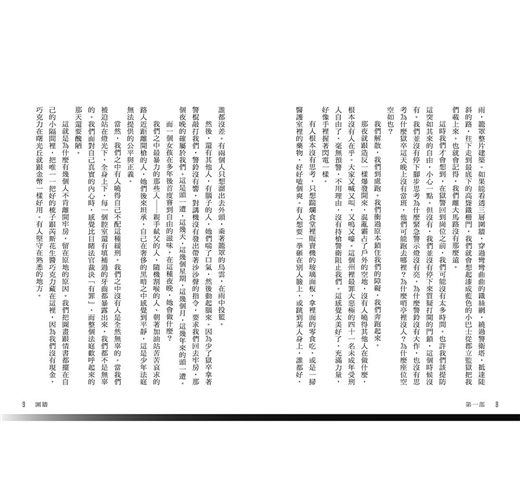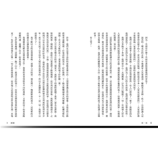 我們很訝異,開心地睜大眼睛,發現B區、C區,還有A區,甚至連D區都是開放的,我們就站在這裡,黑暗裡齊跳的心臟有如雷聲。我們站在牢籠之外,我們站在外面。