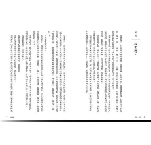 因為那天晚上,我們瘋了。我記得我們打架,我們吶喊,我們躲起來,我們用肉身撞向窗戶。我們手邊有什麼,都拿來蹬腿墊高,我們加快速度逃跑,好像只要夠快就逃得出去一樣,但我們逃得還是不夠遠。