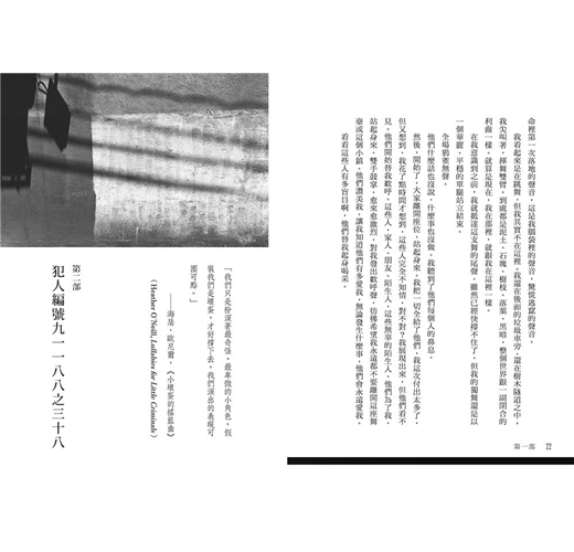 當然,我們之中有人曉得自己不配這種緩刑。我們之中沒有人是全然無辜的。當我們被迫站在燈光下,全身上下,每一個腔室還有填補過的牙齒都暴露出來,我們都不是無辜的。我們面對自己真實的內心時,感覺比目睹法官裁決「有罪」,而整個法庭歡呼起來的那天還要醜陋。