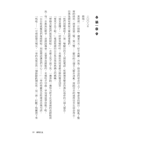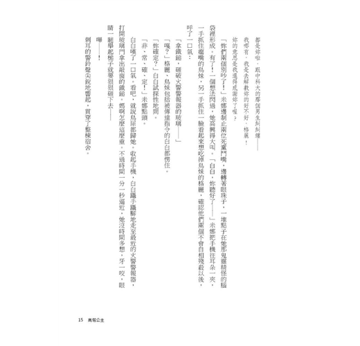 「妳們兩個別吵了!」米娜邊制止兩位死黨鬥嘴,邊轉著眼珠子,一堆點子在她那鬼靈精怪的腦袋裡形成。有了!一個想法閃過,她高興得大叫。「白白,妳聽好了──」米娜把手機往耳朵一夾,一手抓住癟嘴的鳥妹,另一手抓住一臉看起來想吃掉鳥妹的格麗,確認他們兩個不會自相殘殺以後,呼了一口氣: