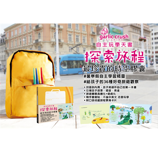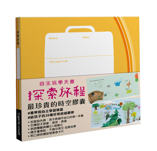 【自主玩學天書:探索旅程】是孩子旅行的最佳隨身好物。父母們都在繁忙辛苦的生活中抽出時間、撥出預算,希望帶孩子進行國內外各種旅遊。但多數的家長不難發現,10歲以下的孩子,如果沒有父母的細心引導與分享,在旅途中最有印象的往往是原本就愛看的電視、原本就愛玩的玩具。【自主玩學天書:探索旅程】透過精心設計的趣味圖文,引導孩子將旅程專案化、遊戲化。協助孩子興奮的觀察、思考、紀錄,從出發前的旅行計畫、出發當天的準備、旅途中的記事、抵達後的觀察、到要返家時的心情。旅行被具體化後,變得更好玩、更精彩,孩子也從旅程中獲得更多。回家後,這本連封面都可被客製化,專屬孩子的天書,成