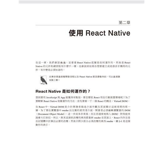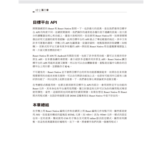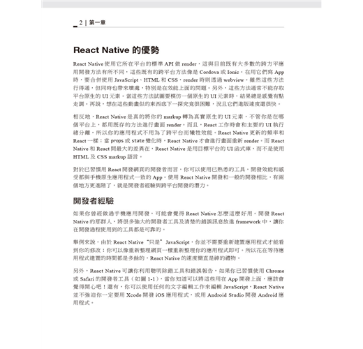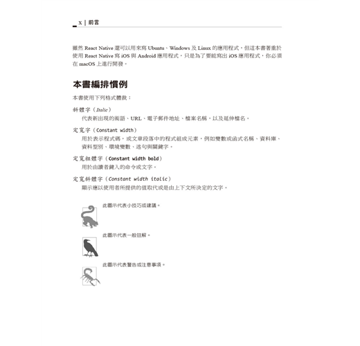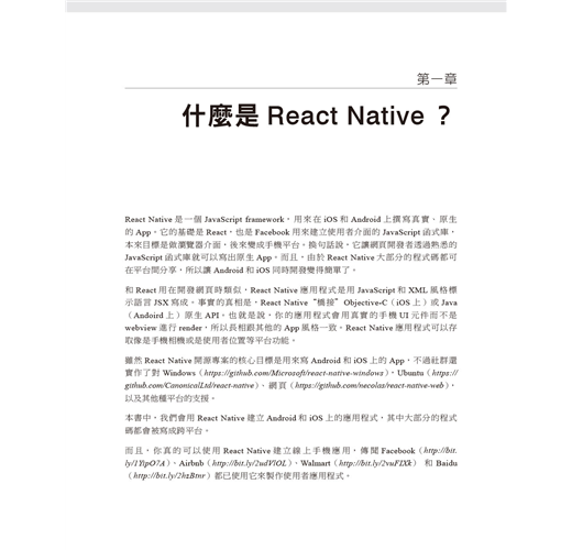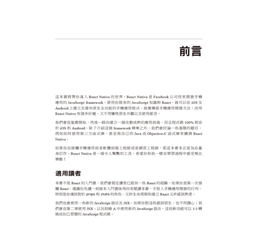 本書以實務的方法介紹React Native。React Native是一個JavaScript framework,用於撰寫和發布完整功能的原生移動裝置應用程式(app)。這本實用指南的第二版,不止說明如何在瀏覽器上開發應用程式,進而向你展示如何在iOS、Android和其它移動平台上進行應用程式的建置。這些應用程式能夠存取平台所提供的相機、使用者位置以及本機儲存等功能。