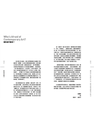 《誰怕當代藝術!》是所有當代藝術須知的大合集,讓你在談論當代藝術時自信滿滿……或者在看展覽時,有能力判斷自己是喜歡還是不喜歡眼前的作品。如果能與朋友侃侃而談高深的議題,例如最先進的科技、某部藝術電影或者下一輪的選戰。談論當代藝術沒道理讓人感到怯場,當代藝術跟那些領域一樣都是專業,但只要稍有了解,同樣可以當作社交時談論的話題。在此邀請您與我們一同踏上這個旅程環遊當代藝術的世界,了解當代藝術的A到Z,待旅程結束後,你不但會發現當代藝術根本沒有什麼好怕的,還會覺得它激發思考而且樂趣無窮。