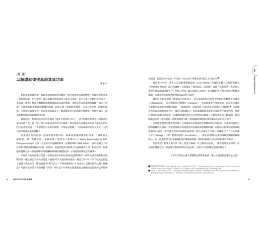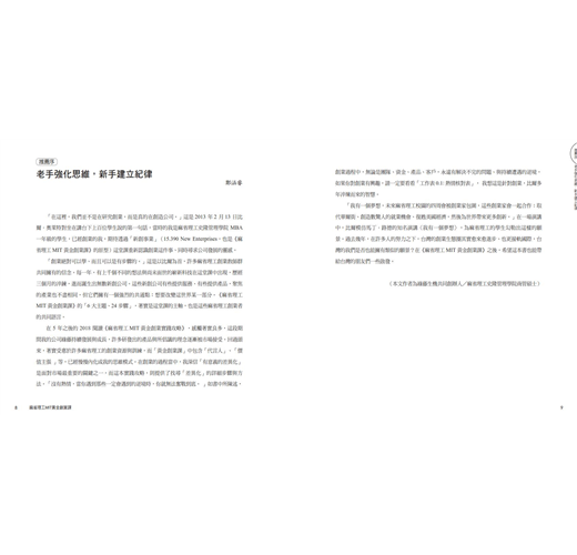 「創業絕對可以學、而且可以是有步驟的。」這是以比爾為首,許多麻省理工創業教師群共同擁有的信念。每一年,有上千個不同的想法與尚未面世的嶄新科技在這堂課中出現,歷經三個月的淬鍊,進而誕生出無數新創公司。這些新創公司有些提供服務、有些提供產品,聚焦的產業也不盡相同,但它們擁有一個強烈的共通點:想要改變這世界某一部分。《麻省理工MIT黃金創業課》的「6 大主題、24 步驟」,著實是這堂課的主軸,也是這些麻省理工創業者的共同語言。──鄭涵睿,綠藤生機共同創辦人暨執行長