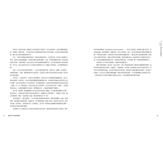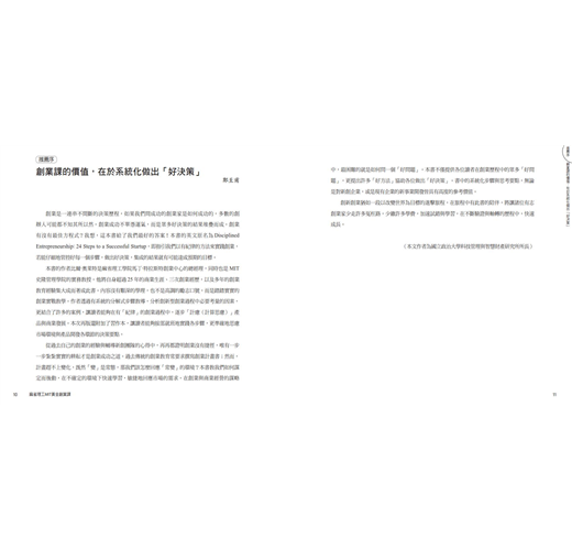 創業是一連串不間斷的決策歷程,如果我們問成功的創業家是如何成功的,多數的創辦人可能都不知其所以然。創業成功不單憑運氣,而是眾多好決策的結果堆疊而成。創業有沒有最佳方程式?我想,這本書給了我們最好的答案!本書的英文原名為Disciplined Entrepreneurship: 24 Steps to a Successful Startup,即指引我們以有紀律的方法來實踐創業,若能仔細地管控好每一個步驟,做出好決策,集成的結果就有可能達成預期的目標。