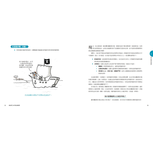 1.使用者:具體而言,哪些人會買你的產品?終端使用者通常都是你的「擁護者」,產品要順利獲得市場青睞,必須要有這一群人。你已經限縮了終端使用者的範疇,但當你在做初級市場研究時,可能會發現某一類還可以進一步細分。但終端使用者不一定是購買產品的決策者,我們會在第12步「找出客戶的決策單位」時討論這一點。如果你做的是小孩的電玩遊戲,玩遊戲的小孩是你的擁護者,因為他會設法對身為經濟性買家的父母死纏爛打,要求後者掏錢。