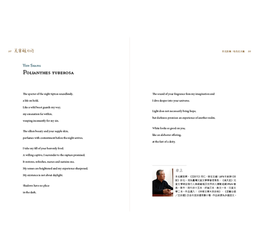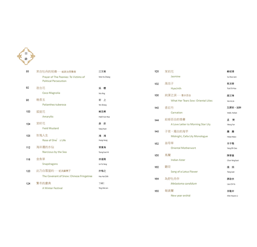 就彷彿一座文化城市之形成,除了臺中市圓滿戶外劇場、大墩文化中心、港區藝術中心等藝文設施的建設之外,更需要在市民的生活中種下綠化身心靈的種苗。市府的文化團隊就像辛勤勞作的農人,不遺餘力、不分晝夜地透過藝文推廣活動來耕耘大家的心田。而這套《花蜜釀的詩─百花詩集》相信會在每位讀者的心中,撒下文學的種子,開出一片美麗的花海。可惜世上繁花之數眾多,撩亂繽紛,詩集因而分為〈臺灣原生篇〉以及〈特色花卉篇〉凝結百花千變萬化中雋永的一面。