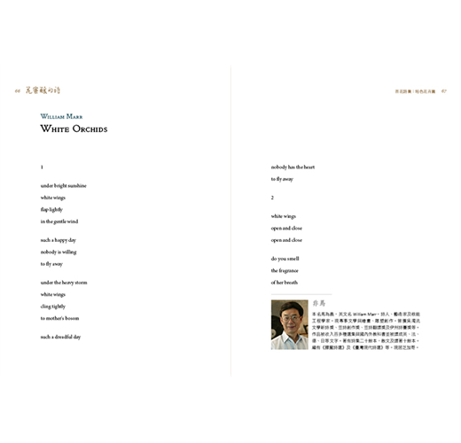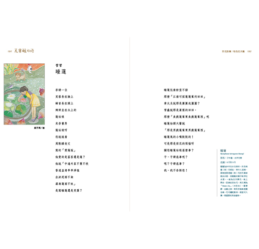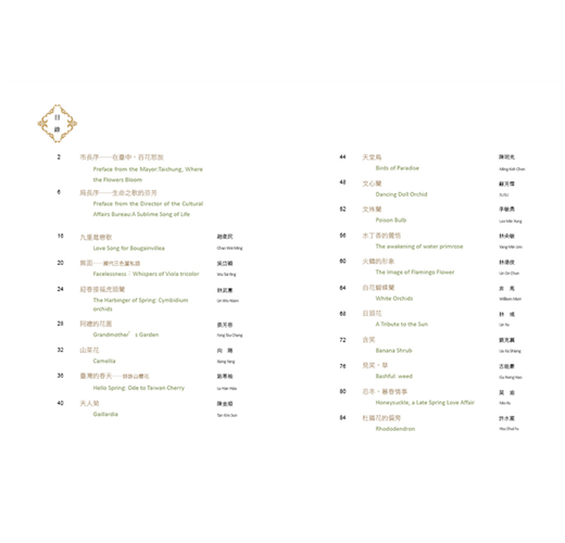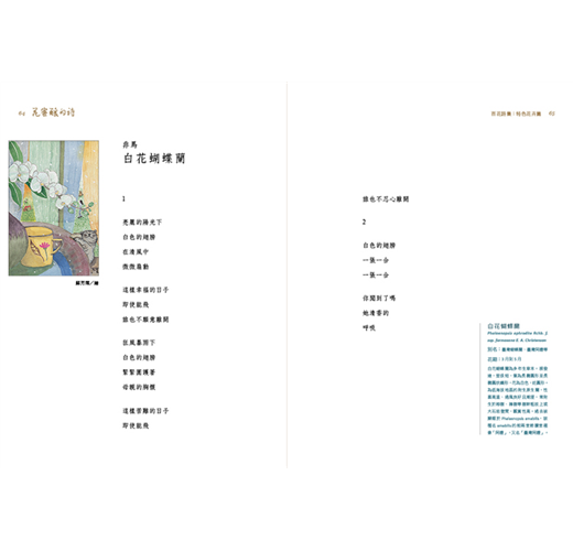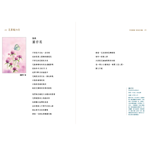 為了記錄這迷人的花花世界,臺中市政府文化局邀集各年代、百位著名的臺灣詩人,各以一種花卉為發想,書寫浪漫的詩文,搭配插畫藝術家彩畫百品精美繪圖,集結成《花蜜釀的詩》。其中收錄的一百種花卉分為〈臺灣原生篇〉與〈特色花卉篇〉,附錄中英對照詩文與花卉簡介,希望能讓不同國度的讀者也能認識臺灣的花卉與詩歌。兩冊詩集可說是一套以詩的語言所構成的百花百科,在按圖賞花之時,兼能薰習自然與人文的芬芳。
