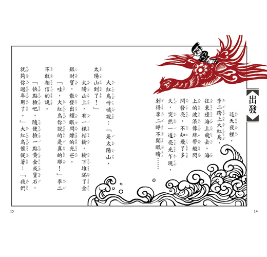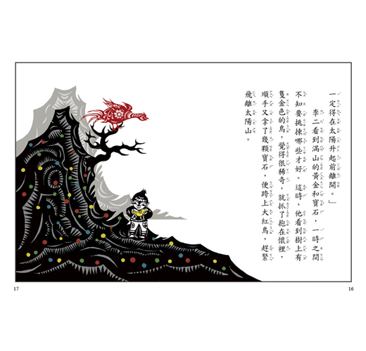 全書貼近民間故事氛圍,作者以剪紙藝術的技法,搭配仿木版畫效果,將民間故事的傳統風采,栩栩如生的表現出來,充滿神祕感與豪邁氣氛。而仿古書裝幀的編排設計,加上每回章節的指引,帶領讀者循著主人公的腳步,歷經一趟緊張、刺激的冒險之旅,看見一路走來,主人公展現不畏懼的勇氣,以及允諾約定的守信和一顆知足之心。