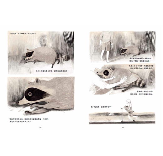 成長是甜美的,是苦澀的。成長是未知的,是冒險的。讓人帶著一些些驚奇、害怕、喜悅與畏懼。有時如同在黑暗中獨自迂迴摸索、迷路。有時眼前又像與家人、同伴攜手走在陽光下,那條筆直坦然的大道上。有時關係又似萍水相逢般短暫,例如路易巧遇的浣熊。