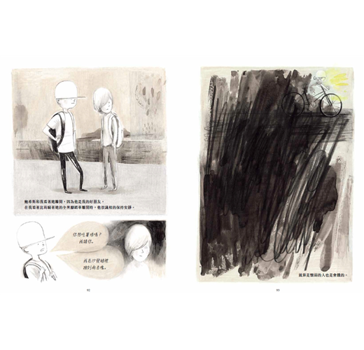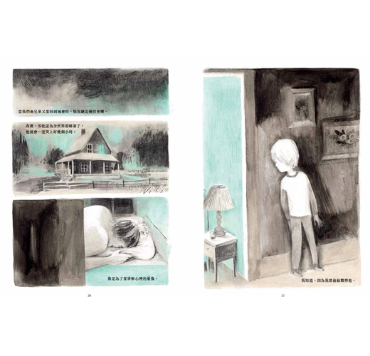從灰暗的雨天和爸爸的哭泣開始,男孩語氣平靜的敘述爸爸醉酒的模樣,大量的畫面鋪排另一條時間線,從鄉間轉折進現在生活的城市,再現孩子眼裡的家庭困境,以及他自己的處境:「我覺得在我的生活裡,沒有任何地方,沒有任何事情,是讓人好過的」。這句話的右頁,男孩被藍色水滴型吶喊的幽靈籠罩。