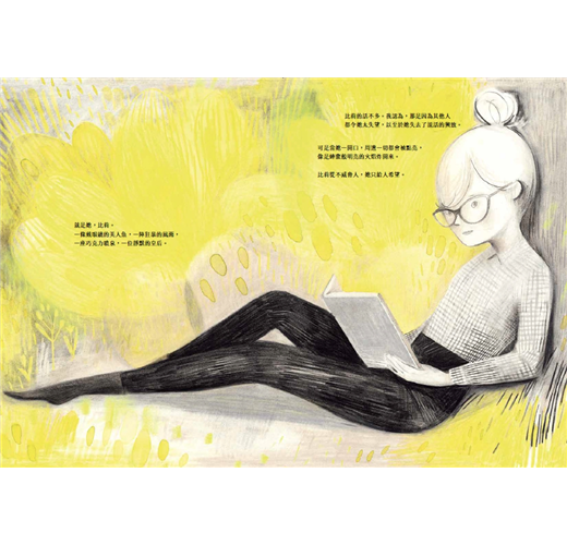 全書文字的運用節制,繪者用細膩的筆觸變化,搭配黑白與單一色彩摹寫心境。一開始只有憂鬱的淡藍色,模糊的灰藍色塊詮釋全家人一起時的記憶,直到帶來希望的比莉,在明亮的金黃色裡登場。作者巧妙運用六○年代的音樂,為瀕臨婚姻危機的夫妻訴說心語,也在文字和畫面之外,帶入懷舊的聲響。