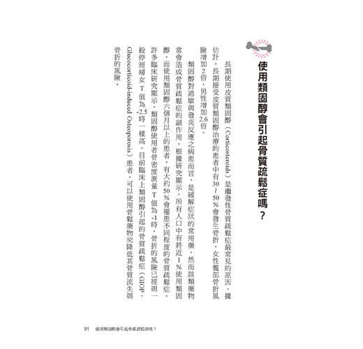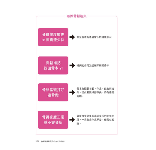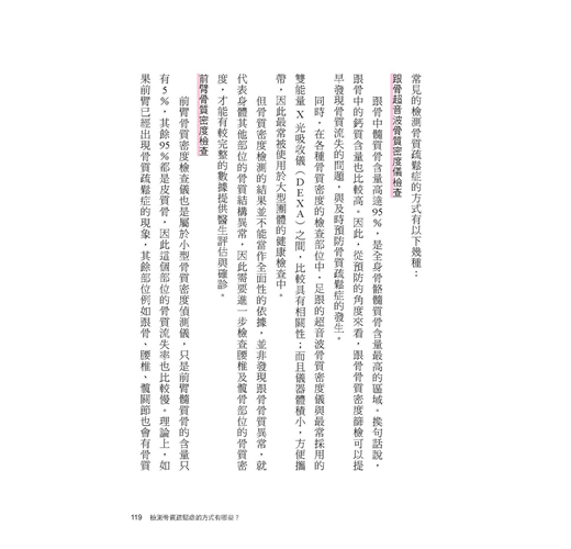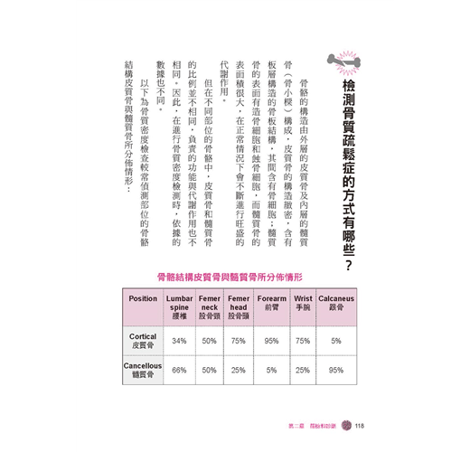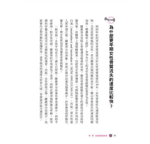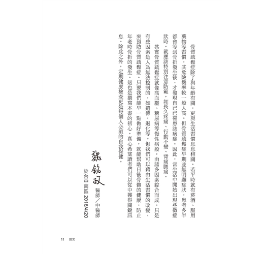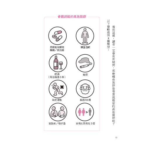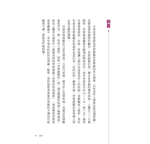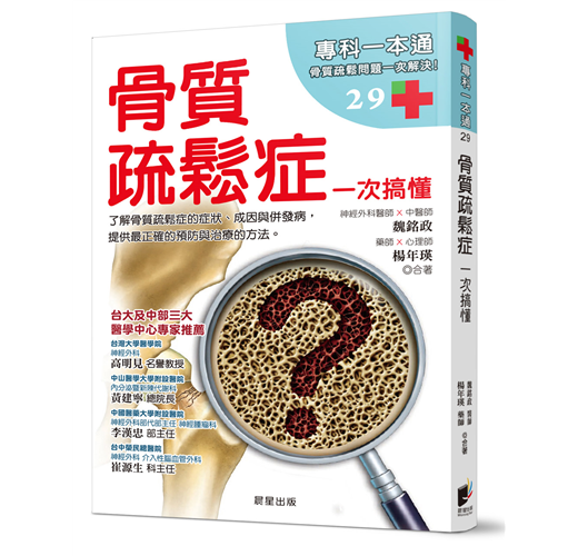 3.從西醫、中醫、日常飲食與保健品等,全方位說明骨質疏鬆的各種問題與治療方式,幫你遠離骨質疏鬆的危機。