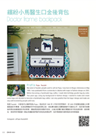 本期推出防水包手作主題!邀請手作家運用布料特性創作出能防雨水、耐髒又好看的包款。有色彩和諧,隔層多的多肉盆栽防水三層包;外觀清爽,可愛又有特色的甜滋滋彩糖球防水後背包;容量大,訴求全家去海邊一包搞定的歡樂之旅親子戲水包;好收納不佔空間的童話夢境折疊式防水包,每款都具實用性與學習價值。