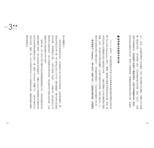 除此之外,本書更可貴之處在於,她並未過度浪漫化這些參訪的中途之家,也並未天真地認為它們可代表整個國家的文化或動物處境。因此在經驗陳述之外,我們不時可看到她對於收容方式的反思,或是置入不同的觀點。