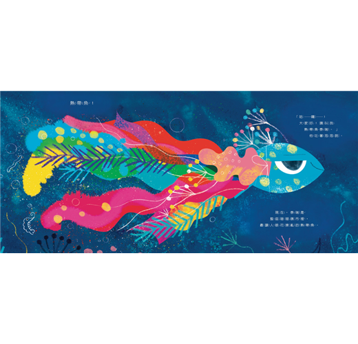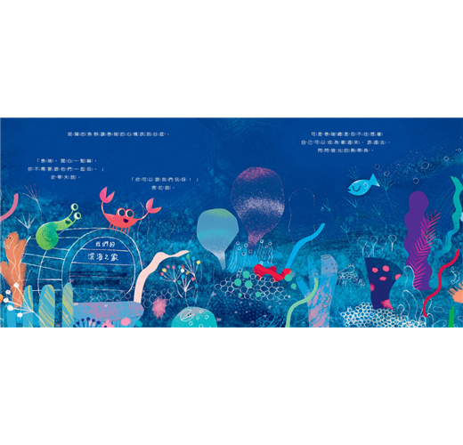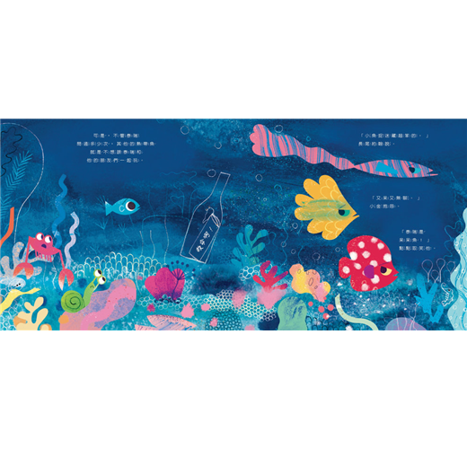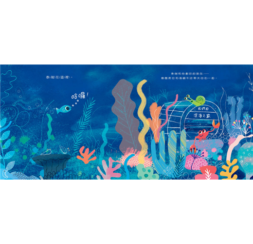 書封及內頁,以整片藍色為背景,閱讀的過程中,彷彿跟著小魚-泰瑞,一起進入這片美麗的海洋。