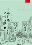 這些閒話,也不必提,內中單表一個少年人物。這少年也未詳其為何省何府人氏,亦不詳其姓名。到了上海,居住了十餘年。從前也跟著一班浮蕩子弟,逐隊嬉遊。過了十餘年之後,少年的漸漸變做中年了,閱歷也多了。並且他在那嬉遊隊中,狠狠的遇過幾次陰險奸惡的謀害,幾乎把性命都斷送了。他方才悟到上海不是好地方,嬉遊不是正事業。一朝改了前非,迴避從前那些交遊,惟恐不速;一心要離了上海,別尋安身之處。只是一時沒有機會,只得閉門韜晦。自家起了一個別號,叫做「死裏逃生」,以誌自家的悼痛。一日,這死裏逃生在家裏坐得悶了,想往外散步消遣;又恐怕在熱鬧的地方,遇見那徵逐朋友;思量不如往城裏去逛逛,倒還清淨些。遂信步走到邑廟豫園,遊玩一番,然後出城。正走到甕城時,忽見一個漢子,衣衫襤褸,氣宇軒昂,站在那裏,手中拿著一本冊子,冊子上插著一枝標,圍了多少人在旁邊觀看。那漢子雖是昂然拿著冊子站著,卻是不發一言。死裏逃生分開眾人,走上一步,向漢子問道:「這本書是賣的麼?可容借我一看?」那漢子道:「這書要賣也可以;要不賣也可以。」死裏逃生道:「此話怎講?」漢子道:「要賣便要賣一萬兩銀子!」死裏逃生道:「不賣呢?」那漢子道:「遇了知音的,就一文不要,雙手奉送與他!」死裏逃生聽了,覺得詫異,說道:「究竟是什麼書?可容一看?」那漢子道:「這書比那太上感應篇,文昌陰騭文,觀音菩薩救苦經,還好得多呢!」說著,遞書過來。死裏逃生接過來看時,只見書面上粘著一個窄窄的簽條兒,上面寫著:「二十年目睹之怪現狀」。翻開第一頁看時,卻是一個手抄的本子,篇首署著「九死一生筆記」六個字。不覺心中動了一動,想道:「我的別號,已是過於奇怪,不過有所感觸,借此自表。不料還有人用這個名字。我與他可謂不謀而合了!」想罷,看了幾條,又胡亂翻過兩頁,不覺心中有所感動,顏色變了一變。那漢子看見,便拱手道:「先生看了必有所領會,一定是個知音!這本書是我一個知己朋友做的,他如今有事到別處去了,臨行時親手將這本書託我,叫我代覓一個知音的人,付託與他,請他傳揚出去。我看先生看了兩頁,臉上便現了感動的顏色,一定是我這敝友的知音;我就把這本書奉送,請先生設法代他傳揚出去,比著世上那印送善書的,功德還大呢!」說罷,深深一揖,揚長而去。一時圍看的人,都一哄而散了。