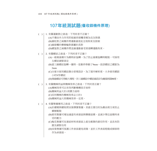 107年機件原理為歷年來考最難的一次,今年共考9題計算題。而本書計算題最多,試題變化性最大,光讀教科書是不夠的,只要深讀本書,再細心注意題目如:半徑、直徑;半角、錐角;內接、外接;同向、反向等要訣即可輕鬆得分。