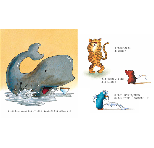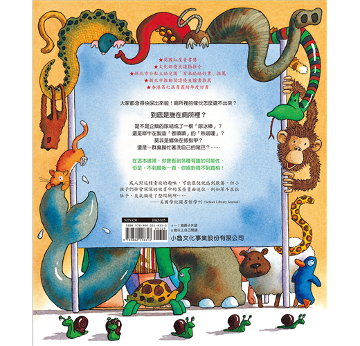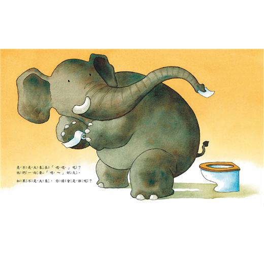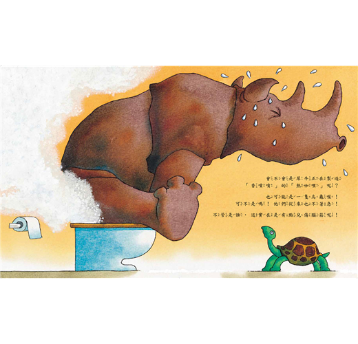 是不是大象在「嗯嗯」呢?(他們總是要「嗯~」很久。)是不是企鵝的尿結成了一根「尿冰棒」?還是犀牛正在製造「香噴噴」的「熱咖哩」?莫非,河馬的肥屁股卡在馬桶上了?還是一群臭鼬忙著洗自己的尾巴?……