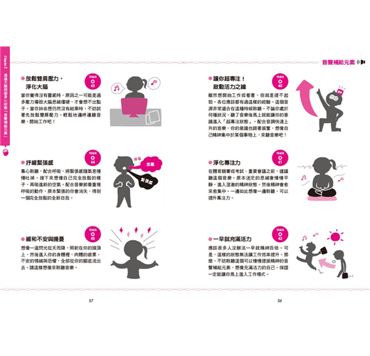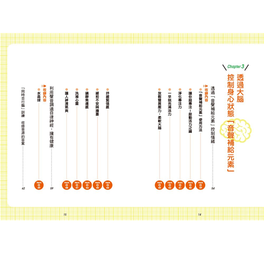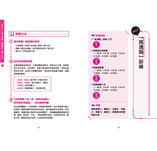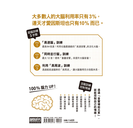 Chapter1 喚醒剩下未使用97%腦力的方法? ●你的大腦只使用3%而已 ●活化右腦是提升腦力的關鍵 ●為什麼只透過聆聽就能活化大腦呢? ●腦力提升簡易3步驟 ●實踐過本書訓練方法的人士感言 ●透過大腦控制身心狀態 ●「音聲補給元素」&「水晶球」 Chapter2 只要3個步驟,就能讓你的「腦力」升級 ★Step1 「高速腦」訓練 【收錄內容】 ●「高速腦」訓練入門 ●超高速古典音樂(一般速、2倍速、4倍速、8倍速、16倍速、32倍速、64倍速) ●超高速歌劇(一般速、2倍速、4倍速、8倍速、16倍速、32倍速、64倍速) ●超高速繞口令(一般速、2倍速、4倍速、8倍速、16倍速、32倍速、64倍速) ★Step2 「同時並行腦」訓練 【收錄內容】 ●「同時並行腦」訓練入門 ●聖德太子之耳 初級(2音、4音、6音) 中級(2音、4音、6音、8音) 高級(2音、4音、6音、8音、10音、12音) ★Step3 利用高周波放鬆大腦 【收錄內容】 ●利用高周波放鬆大腦入門 ●高周波音聲 Chapter3 透過大腦控制身心狀態「音聲補給元素」 ★透過「音聲補給元素」控制情緒 ●「音聲補給元素」使用方法 ●讓你超專注!啟動活力之鑰 ●集中專注力 ●一早就充滿活力 ●放鬆雙肩壓力,舒緩大腦思緒 ●舒緩緊張感 ●緩和不安與擔憂 ●鎮靜焦慮感 ●洗滌心靈 ●讓人神清氣爽 ★利用聲音調適自律神經,擁有健康 【收錄內容】 ●水晶球 ◎「同時並行腦」訓練 收錄音源的答案