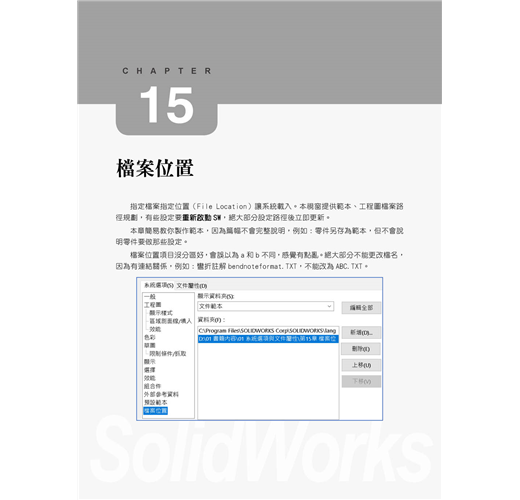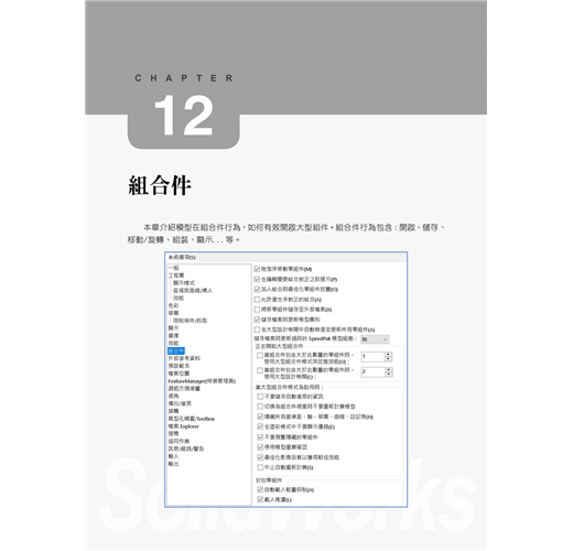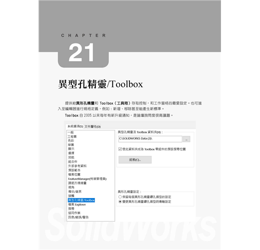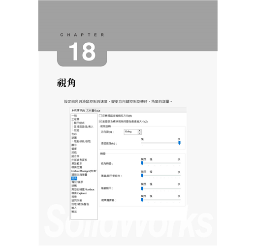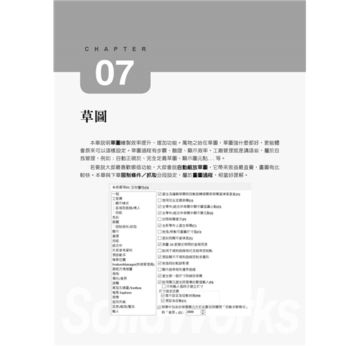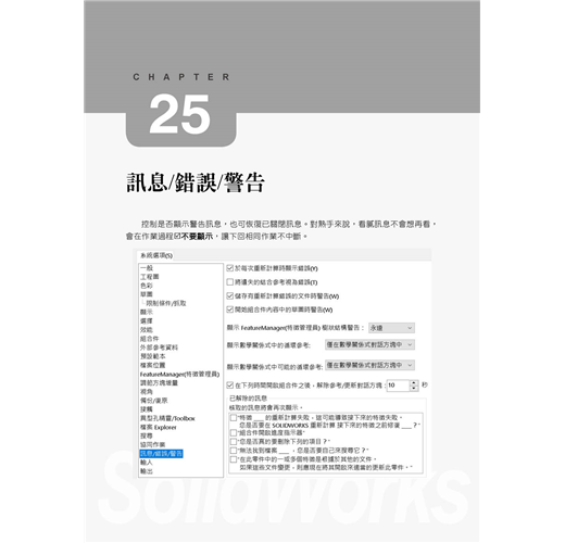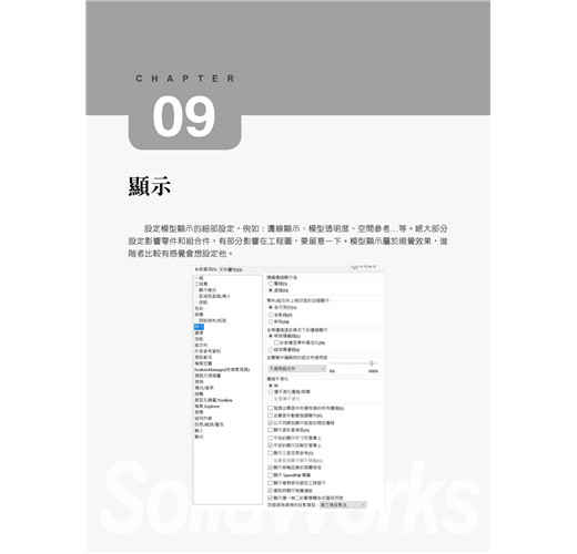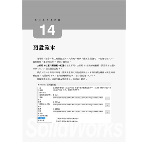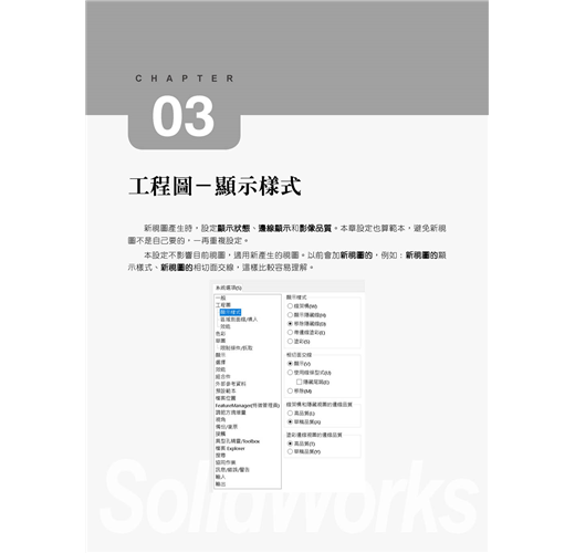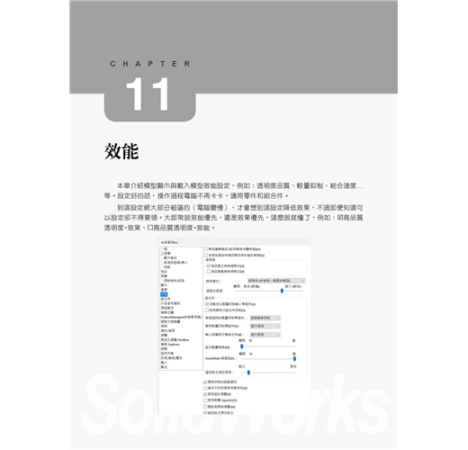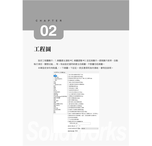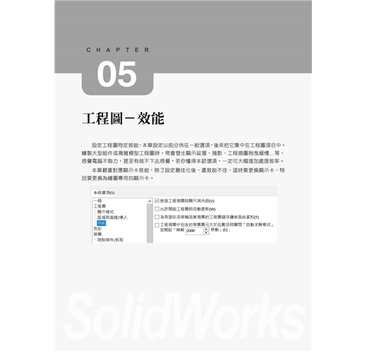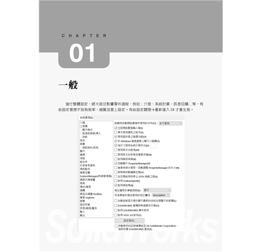 書中所演示的各式實例,都是透過SolidWorks的選項設定,達到最佳執行效能、提升設計/製圖的效率。學會如何設定「系統選項」與「文件屬性」,將可定義出屬於自己或公司的設計規範,進而促使文件規格化,達到事半功倍的成果。