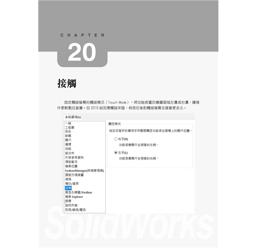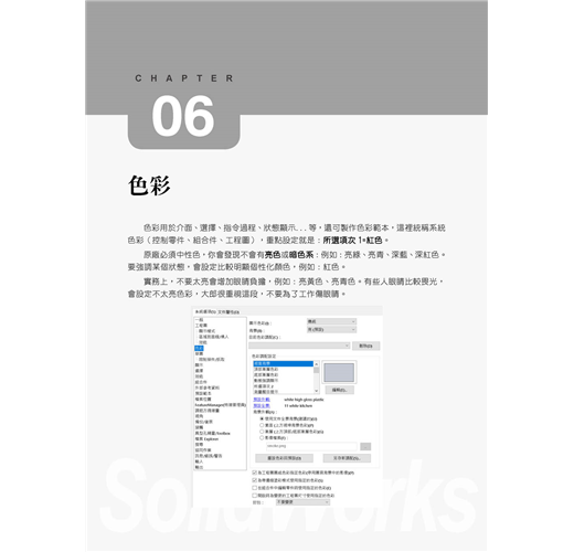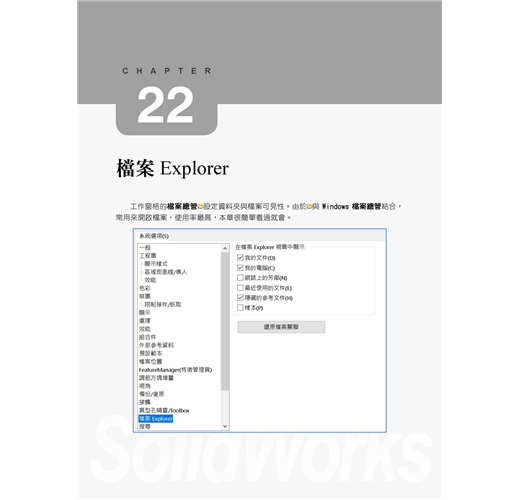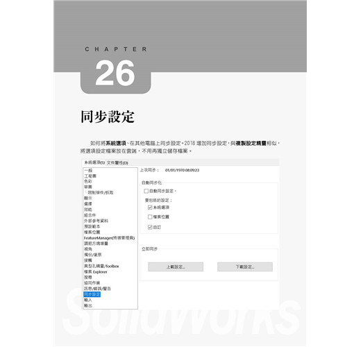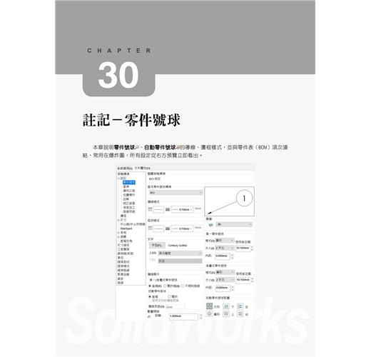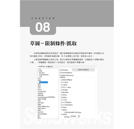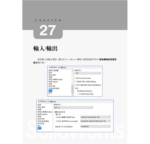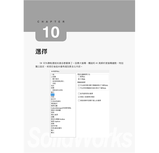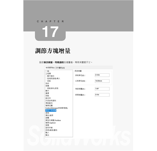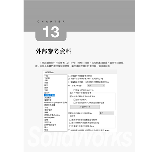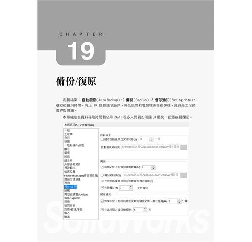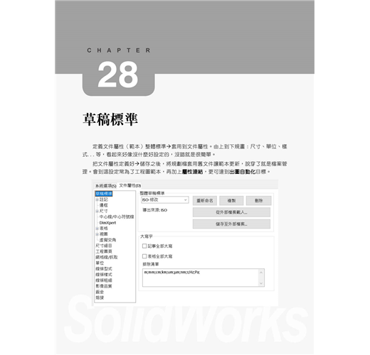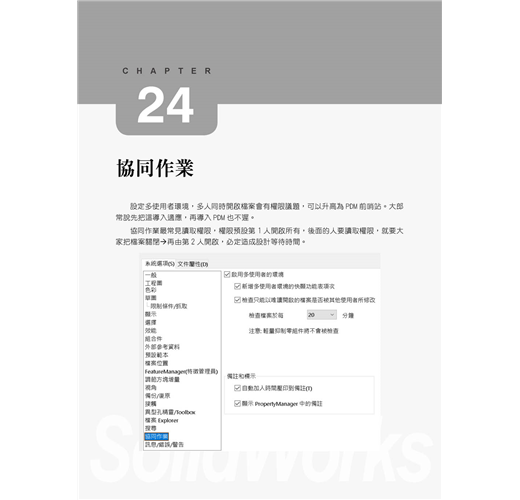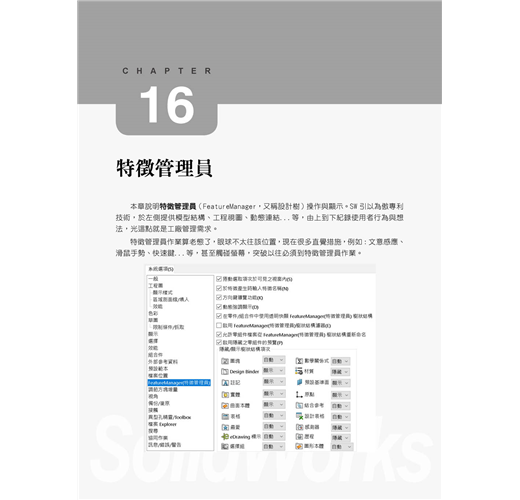 書中所演示的各式實例,都是透過SolidWorks的選項設定,達到最佳執行效能、提升設計/製圖的效率。學會如何設定「系統選項」與「文件屬性」,將可定義出屬於自己或公司的設計規範,進而促使文件規格化,達到事半功倍的成果。