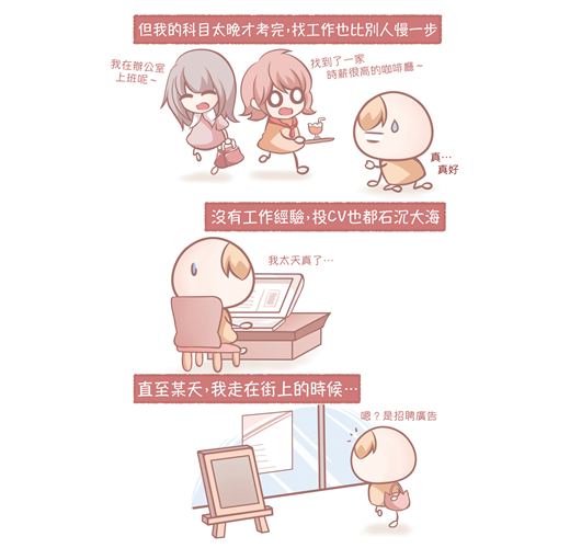 進大學後重拾畫筆,將自己兩個興趣結合,成為了網絡圖文作家,亦幸運地擁有了一群支持者。找到目標並不容易,能有機會實踐理想更是奢侈,現在每一天都學著感恩,期望哪天也能與崇拜的作者們在同一條路上向夢想進發。